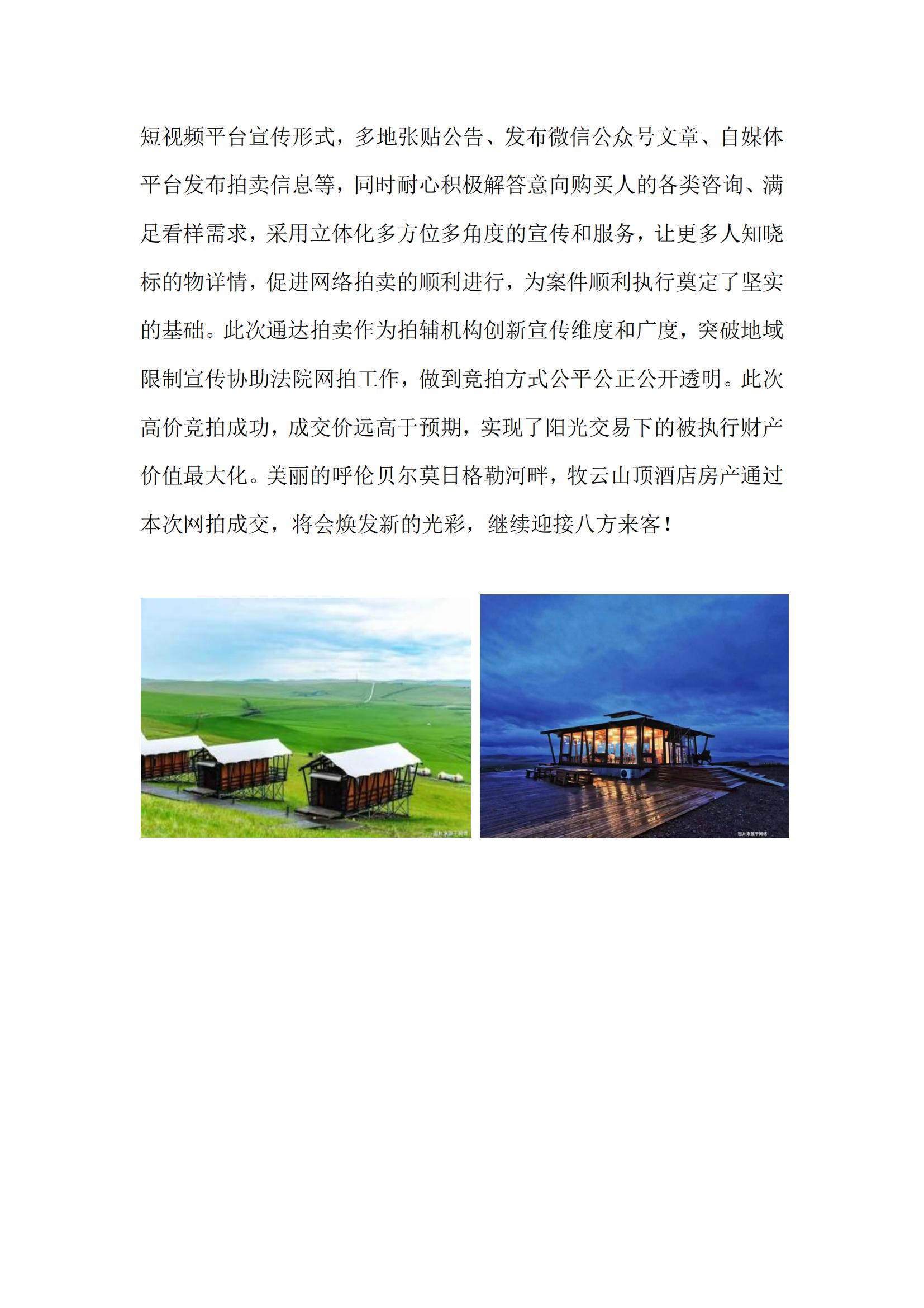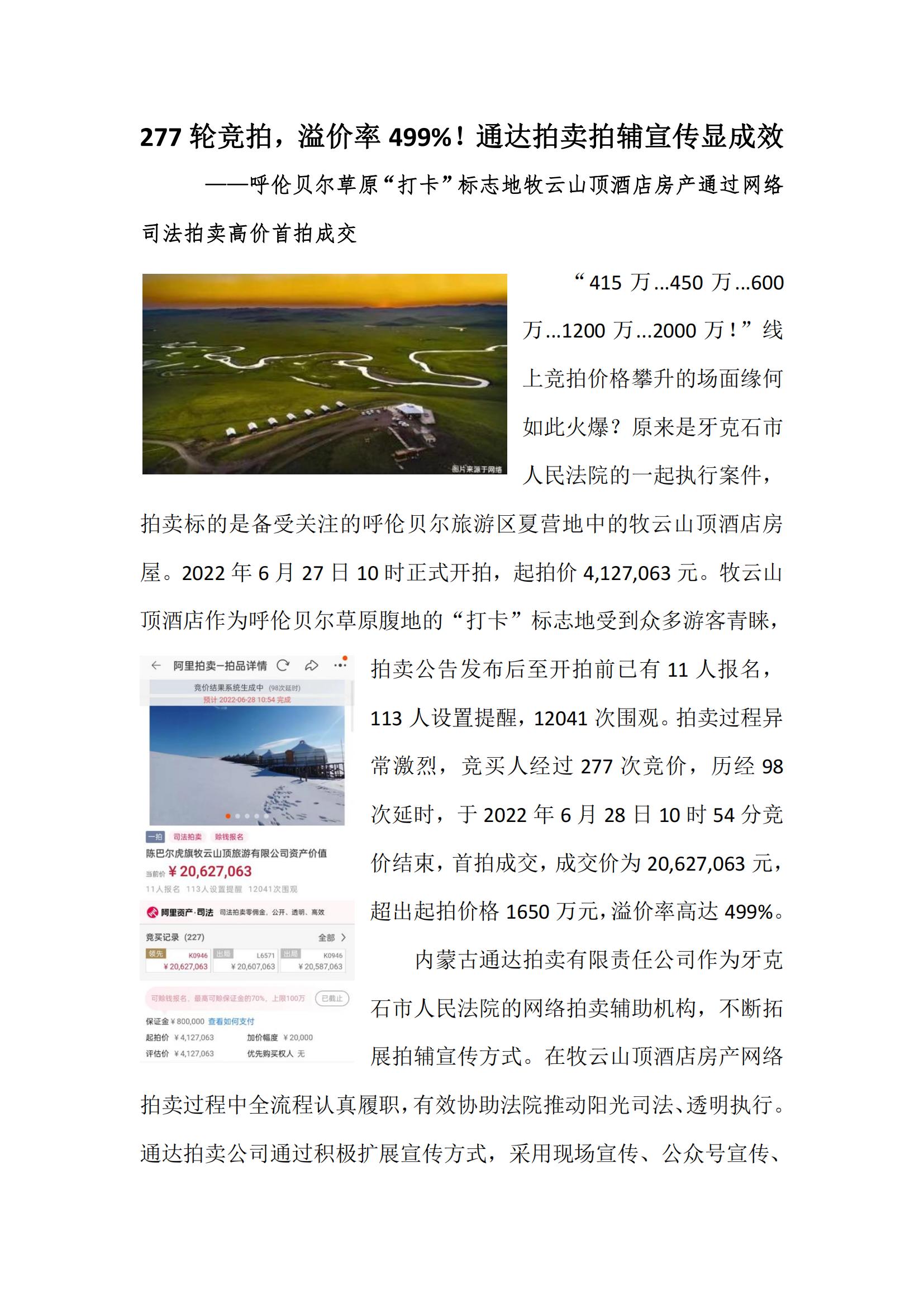 專業(yè)拍賣機構(gòu),助力司法拍賣 我區(qū)拍賣企業(yè)開始入圍法院司輔機構(gòu)已經(jīng)兩年有余,在入圍的這兩年多時間里,拍賣企業(yè)作為專業(yè)的拍賣機構(gòu)不斷的完善自身,利用我們的專業(yè)助力司法拍賣,提高司法拍賣的成交額。拍賣企業(yè)的專業(yè)就是拍賣,作為司法輔助機構(gòu),我們拍賣企業(yè)更能夠從委托方角度出發(fā),從標的角度出發(fā),從競買人的角度出發(fā),深刻的了解各方的切實需求。也更可以找到標的的亮點從而非常專業(yè)的對其進行宣傳,通過拍賣企業(yè)本身的客戶資源以及通過網(wǎng)站、公眾號、宣傳視頻等多種新的宣傳自媒體齊發(fā)力,已經(jīng)突破了地域限制,使得更多的潛在買家可以看到和了解標的。同時專業(yè)的拍賣公司有著強大的拍賣實力和風(fēng)控能力,對于拍賣過程中出現(xiàn)的問題以及未出現(xiàn)的問題都會做到提前準備預(yù)案,這樣為標的的最后成交奠定了專業(yè)而扎實的基礎(chǔ)。因為術(shù)業(yè)有專攻,讓專業(yè)的人做專業(yè)的事更能讓他們發(fā)揮所長,讓價值得到最大化,也能盡快的找到解決辦法,從而節(jié)省成本。 昨天收到來自內(nèi)蒙古通達拍賣有限責(zé)任公司的好消息,位于呼倫貝爾草原“打卡”標志地的“牧云山頂酒店”房產(chǎn)網(wǎng)絡(luò)司法拍賣通過該企業(yè)的輔助宣傳,網(wǎng)絡(luò)拍賣產(chǎn)生了激烈的競價,經(jīng)過277 輪競價后,最終以 20,627,063 元成交,溢價率達到 499%。 這便是一個很好的例子,希望我們?nèi)珔^(qū)的拍賣企業(yè)都能充分發(fā)揮自身專業(yè)優(yōu)勢,助力司法拍賣,在這一領(lǐng)域開疆?dāng)U土,以此為契機,從點到線再到面的全面發(fā)展。