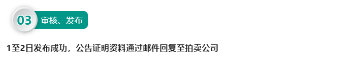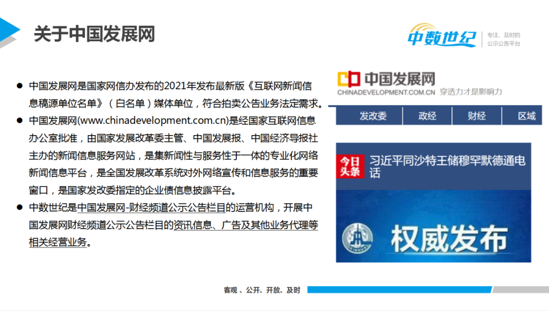 拍賣公告的依法合規(guī)發(fā)布,是拍賣企業(yè)規(guī)范運營、拍賣交易有別于其它交易的重要體現(xiàn)。中國發(fā)展網(wǎng)財經(jīng)頻道在公示公告欄目為拍賣企業(yè)開通了發(fā)布咨詢信息、發(fā)布公示公告的權(quán)限。在中國發(fā)展網(wǎng)發(fā)布公告,符合《互聯(lián)網(wǎng)新聞信息管理規(guī)定》相關(guān)法律法規(guī)要求,與傳統(tǒng)紙質(zhì)媒介具有同等法律效力,并有區(qū)塊鏈存證下載技術(shù)。在網(wǎng)絡(luò)平臺發(fā)布公告還可改善“拍賣公告”傳播范圍和公告信息留存,更預(yù)示著行業(yè)迎來“新風(fēng)向”。 相較于以報紙為代表的傳統(tǒng)公告發(fā)布渠道,公示公告平臺具有三大優(yōu)勢: 第一,及時便捷。不被發(fā)版時間掣肘,發(fā)布更高效。 第二,版面優(yōu)化與擴大。專有的“公示公告”欄目,讓你的公告更加醒目,形成信息圈層,吸引高質(zhì)量關(guān)注;用圖文混排的形式,讓公告發(fā)揮更大的價值。 第三,即刻分享。每篇公告擁有獨立鏈接,動動小手廣而告之。 專注、及時的公示公告平臺讓拍賣企業(yè)體驗數(shù)智時代的更優(yōu)選擇!